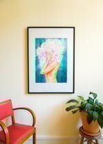 Peinture originale à l'aquarelle d'une femme tenant sa tête remplacée par des fleurs, entourée d'un fond cosmique. Cette « Femme-Fleur » vibre d'énergie, de puissance et de sensualité, ce qui résonne avec "l'empowerment" qui réside dans l'acceptation de la capacité d'une femme à être forte, intelligente et sensuelle. Cette œuvre est aussi une invitation à s'enraciner dans nos valeurs, à s'épanouir à travers nos expériences et à laisser fleurir la pleine puissance de notre potentiel.